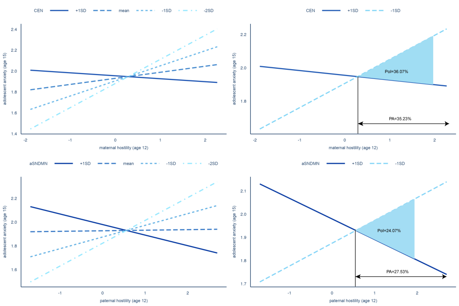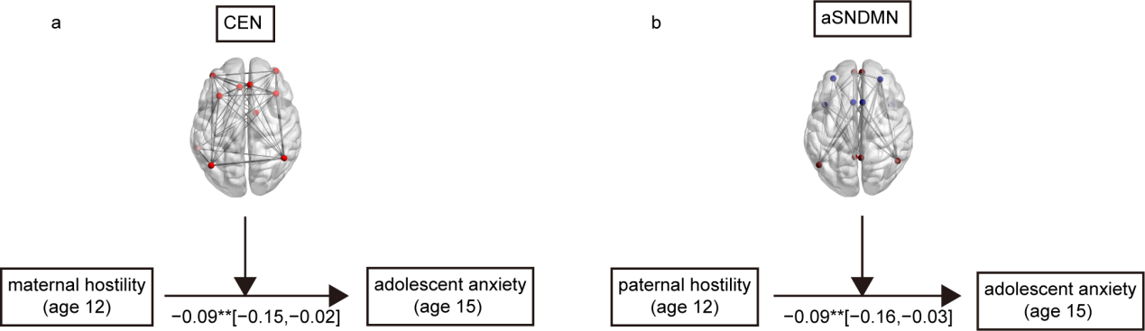 研究结果发现,中央执行网络内较低的连接性放大了母亲敌意对焦虑症状的影响;前突显网络和默认模式网络之间的高度反相关放大了父亲敌意对焦虑症状的影响(图1)。