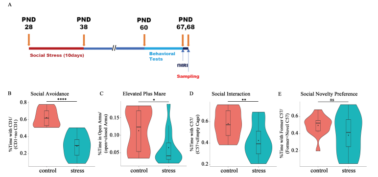 基于此,为探究早期应激诱导的特定脑区表观遗传学修饰的整体变化是否是rs-fMRI变化的分子机制之一,永乐汇王玮文研究组和严超赣研究组开展了一项合作研究。研究基于前期建立的拟人类儿童青少期同伴霸凌动物模型—社会挫败应激,结合分子生物学和静息态功能磁共振成像(rs-fMRI)技术,调查了早期应激对小鼠成年后情绪行为、mPFC脑区表观修饰改变和静息态功能活动的关系。
