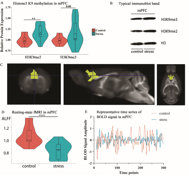 图2.应激后mPFC脑区ALFF降低而H3K9me2升高