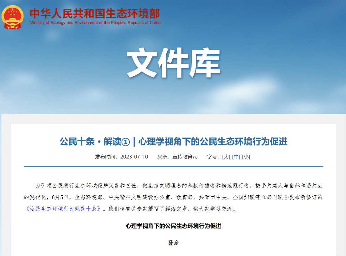 6月5日,生态环境部、中央精神文明建设办公室、教育部、共青团中央、全国妇联等五部门联合发布了新修订版《公民生态环境行为规范十条》(以下简称“公民十条”)。基于研究组的相关研究成果与思考,孙彦对“公民十条”进行了深度解读,该解读文件目前已被生态环境部文件库收录,凸显了心理学视角在理解和推广亲环境行为方面的重要性(图4)。