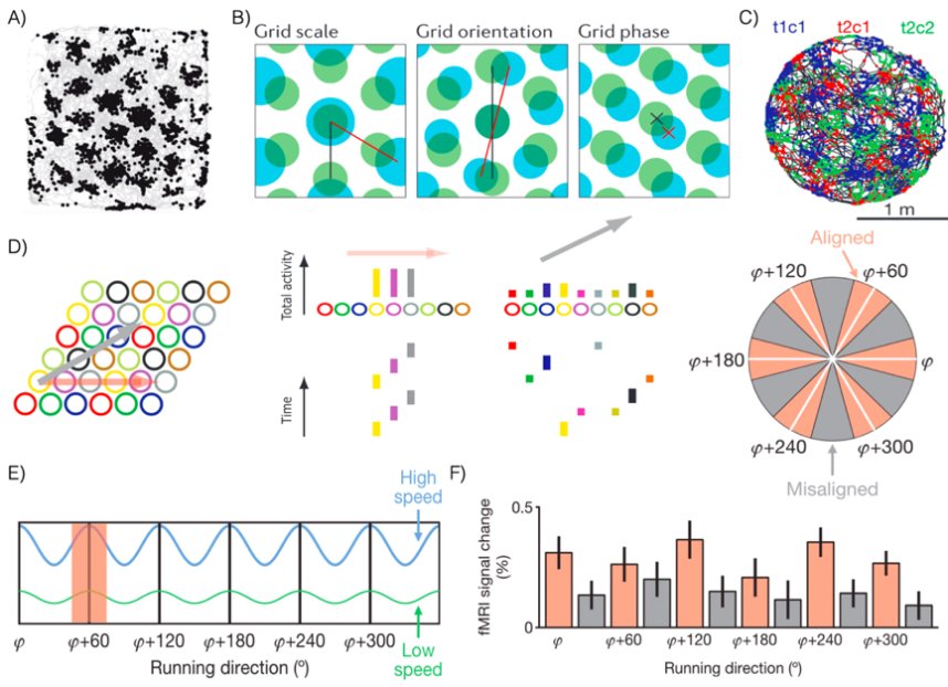 图1. 网格细胞的空间调谐和网格集群的六向调制信号