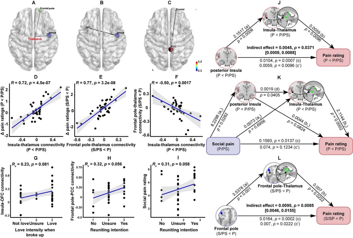 进一步的功能磁共振实验发现,当人们关注社会疼痛时,社会疼痛对躯体疼痛产生的抑制作用主要与额极有关,而当人们不关注社会疼痛时,社会疼痛对躯体疼痛产生的易化作用与后脑岛有关(图2),而丘脑同时调节抑制和易化两个过程,在不同的社会疼痛关注状态下对疼痛感知进行调节 (图3)。