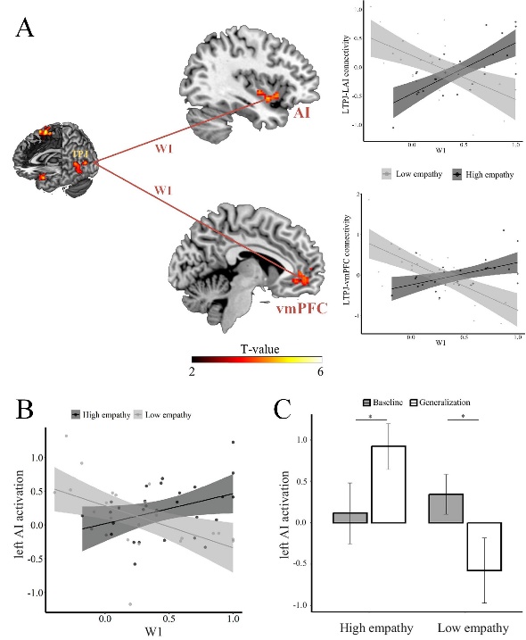 注:(A)左侧TPJ(加工观察学习误差的核心脑区)与左侧AI,vmPFC的功能连接受到观察学习的调节(W1,代表个体共情受观察学习预期误差影响的程度)。(B)左侧AI的激活程度受到观察学习的调节。(C)直接比较泛化期与基线期的左侧AI的激活强度,高共情组的左侧AI激活得到提升,而低共情组左侧AI激活发生减弱。
