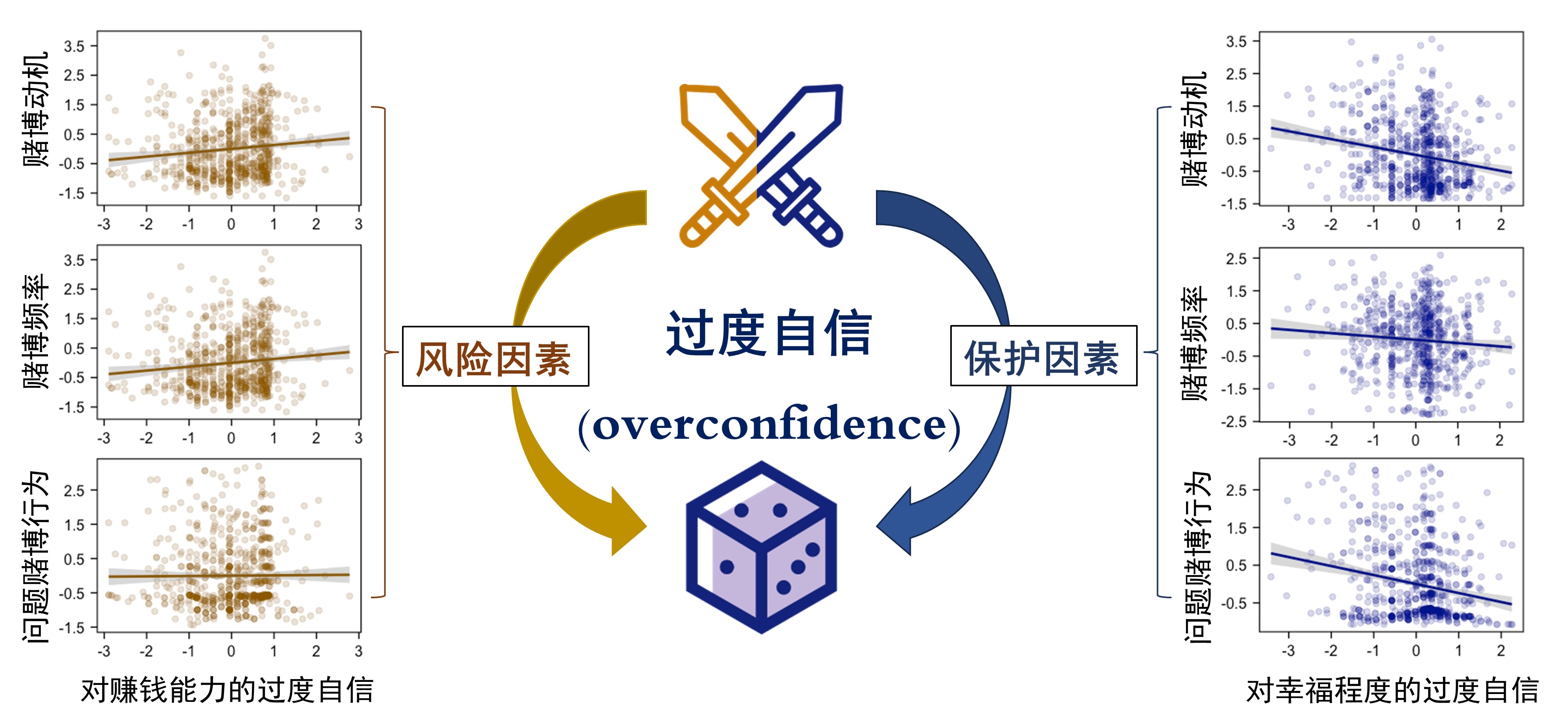 图1. 对赚钱能力/幸福程度的过度自信影响赌博的双刃剑效应