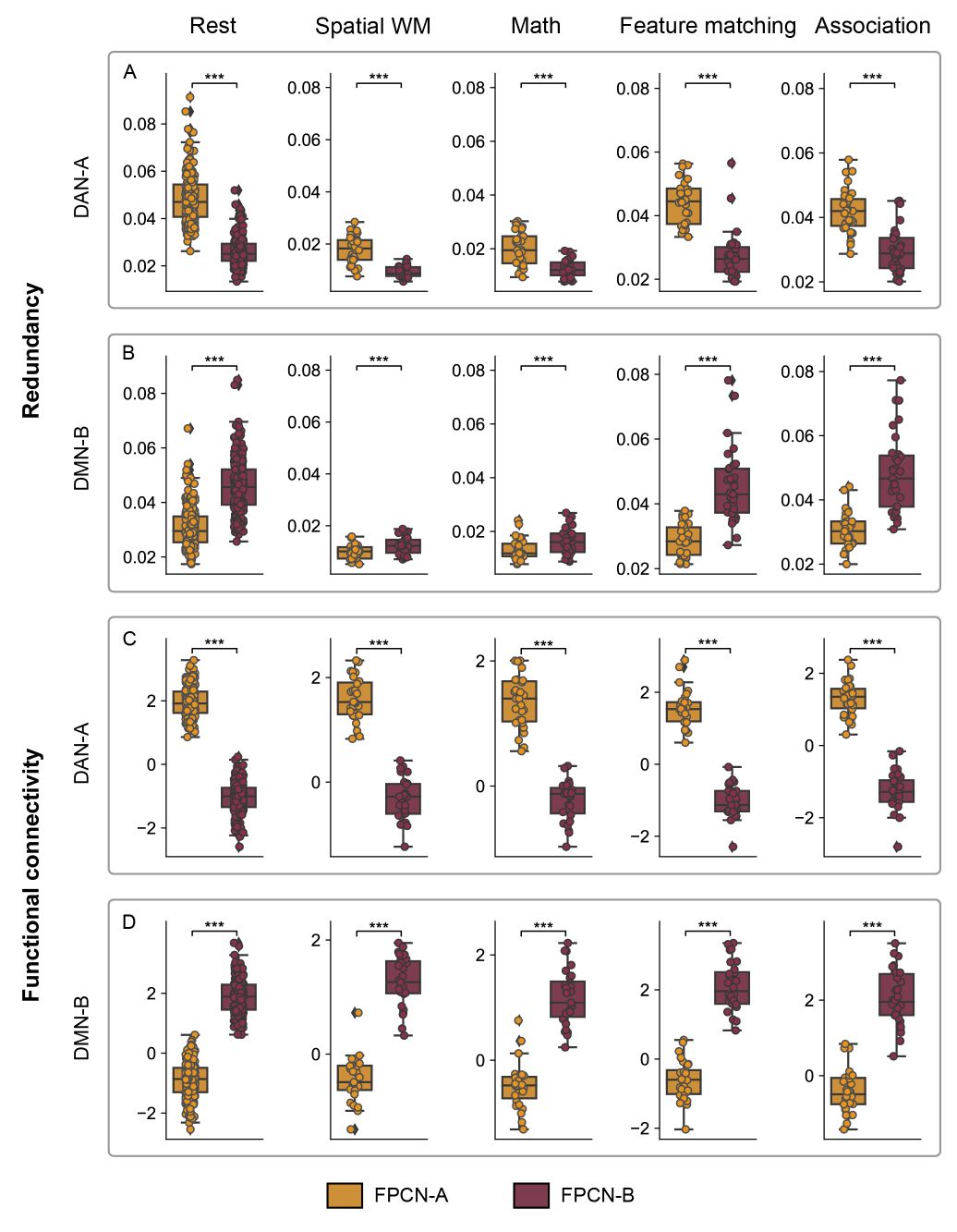 额顶控制网络的独特拓扑结构使其能够支持多种功能行为模式。例如,当当前任务主要依赖工作记忆时,额顶控制网络会分成两个不同的子系统。在这种情况下,FPCN-A与背侧注意网络(DAN)的合作变得更加紧密。相反,如果任务主要依赖长期记忆,额顶控制网络则表现为一个更加统一的系统,此时FPCN-A和FPCN-B之间的协作增强(图3)。