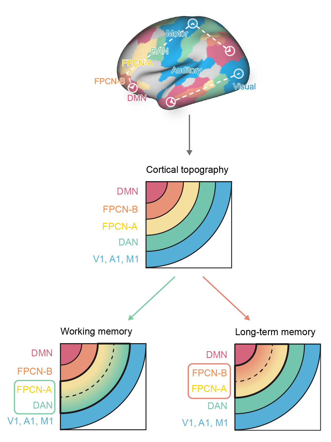 图1. 人脑的皮层拓扑组织模式:FPCN-A更靠近感觉运动系统和背侧注意网络;FPCN-B更靠近负责长时记忆的默认网络。