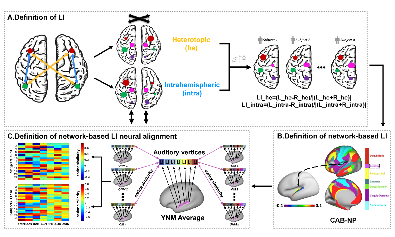 图 1 研究流程图。A. 脑功能偏侧化定义。LI_intra: 半球内功能连接偏侧化;LI_he: 半球间异位功能连接偏侧化。B. 基于脑网络的功能偏侧化定义。CAB-NP: Cole-Anticevic Brain-wide Network Partition. SMN:感知运动网络;CON:伞盖网络;DAN:背侧注意网络;LAN:语言网络;FPN:额顶控制网络;AUD:听觉网络;DMN:默认网络。C. 基于脑网络功能偏侧化的神经齐性定义。OM:老年音乐家;ONM:老年非音乐家;YNM:青年非音乐家。