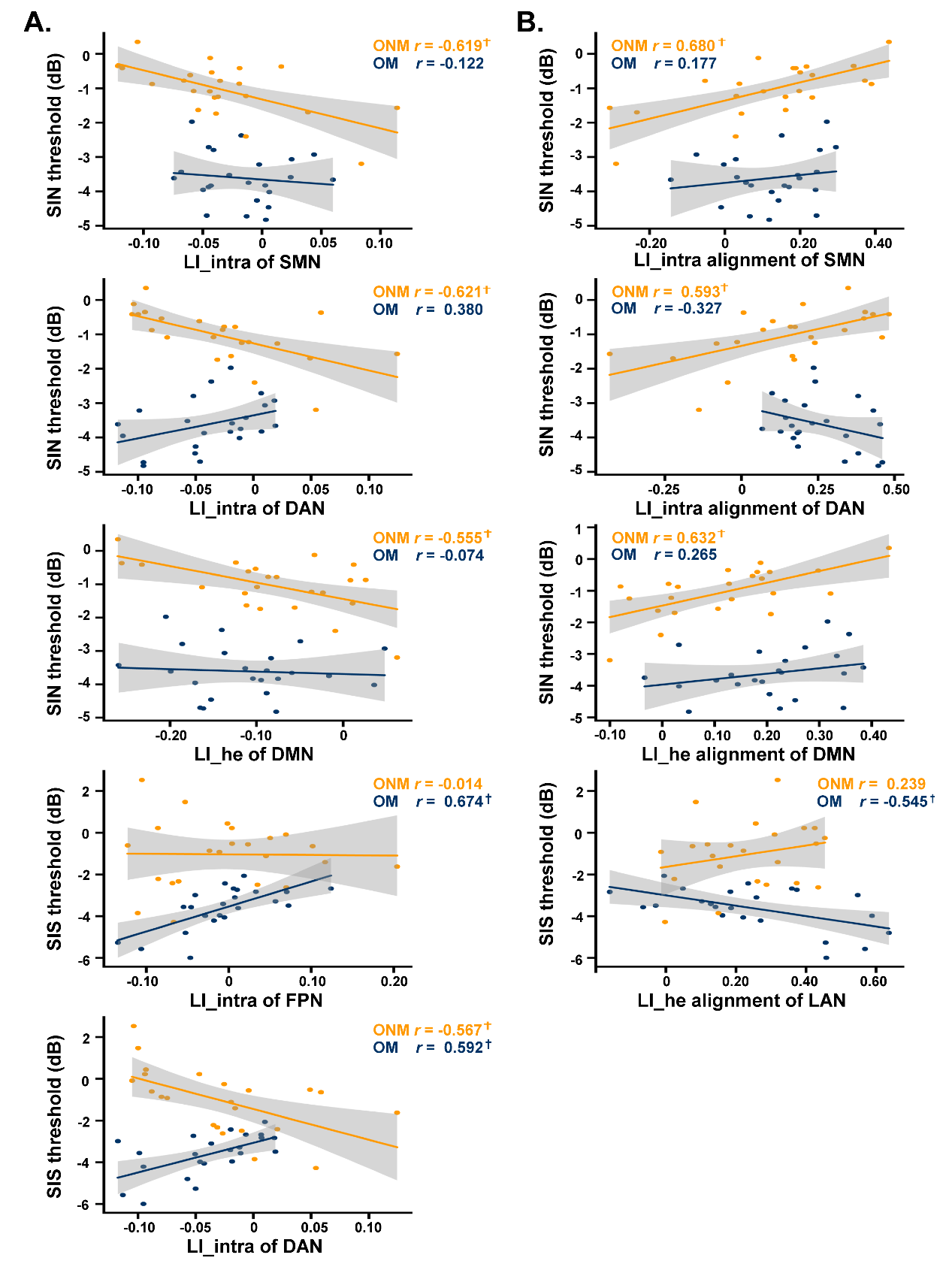 图3 老年人脑功能偏侧化及其神经齐性指数与噪音下言语识别任务的相关。A. 脑功能偏侧化与噪音下言语识别任务的相关。B. 脑功能偏侧化神经齐性指数与噪音下言语识别任务的相关。LI_intra:半球内功能连接偏侧化;LI_he:半球间异位功能连接偏侧化。SIN:噪声掩蔽下言语识别任务;SIS:语音掩蔽下言语识别任务。SMN:感知运动网络;DAN:背侧注意网络;DMN:默认网络;FPN:额顶控制网络。LAN:语言网络。ONM:老年非音乐家;OM:老年音乐家。