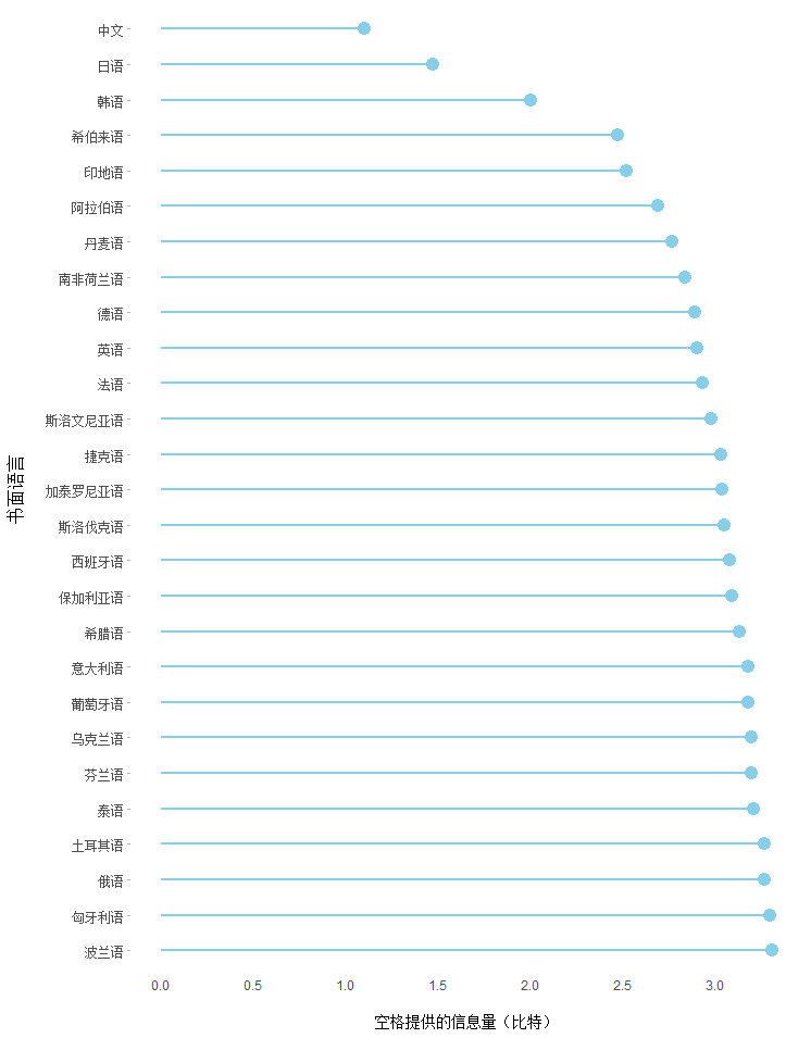 图2二十七种语言中词间空格为确定词边界提供的信息量