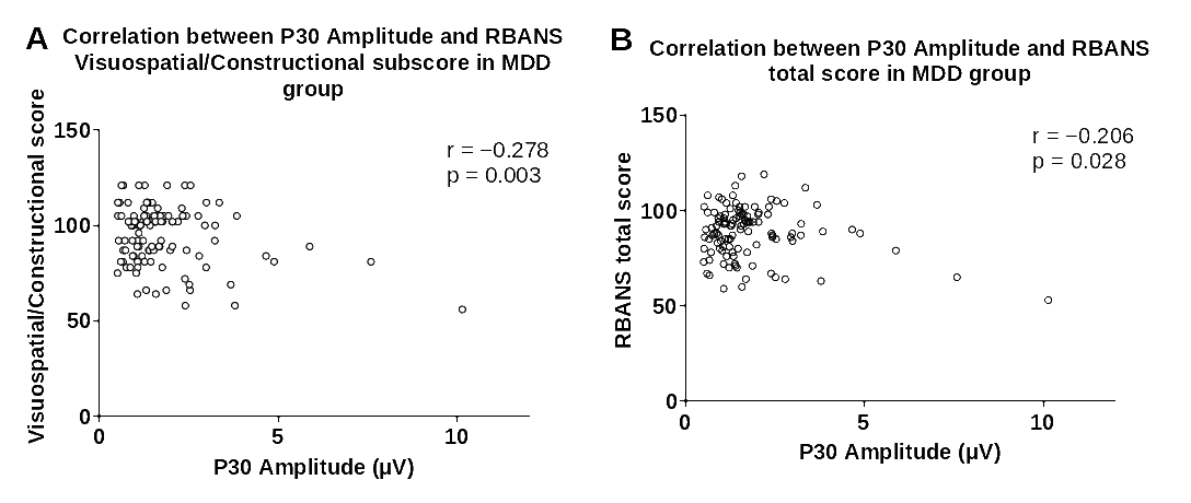 研究结果显示,抑郁症患者P180波幅显著低于健康对照人群。在抑郁症患者中,P180波幅与抑郁、焦虑症状得分呈显著负相关;P30波幅与RBANS视觉空间/结构得分和总分呈显著负相关。多元回归分析表明,P180波幅能负向预测患者的抑郁及焦虑症状;P30波幅、发病年龄和教育程度能负向预测患者的认知功能。