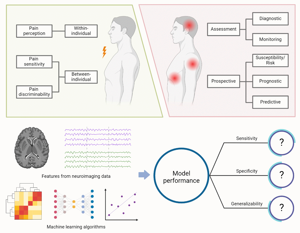 神经生物标志物是反映“生理过程、病理过程或对某种暴露或干预(包括治疗干预)的响应”的神经特征。作者基于研究组的前期研究成果,针对急性痛提出了一种新的神经标志物分类方法,将其分为被试内疼痛感知、被试间疼痛敏感性和被试间疼痛辨别力三类理论上不同的神经标志物。被试内疼痛感知刻画了同一个体在不同状态下的疼痛知觉变化,被试间疼痛敏感性代表了不同个体对单一疼痛刺激的感受性个体差异,而被试间疼痛分辨力则表征了不同个体对多个疼痛刺激的区分能力个体差异。针对慢性痛,文章结合FDA-NIH生物标志物工作组对生物标志物的分类,将慢性痛神经标志物分为了评估性(assessment)和预测性(prospective)标志物。前者用于慢性痛的诊断以及慢性痛程度的监测,后者则用于预测急性痛发展成慢性痛的风险,慢性痛自发痊愈或恶化的概率,以及药物/干预对慢性痛的治疗效果。按照这一疼痛神经标志物分类框架,该文章全面总结了利用脑电和磁共振成像等神经影像技术开发的急性痛和慢性痛神经标志物,并从敏感性、特异性和泛化性三个方面评价了相应神经标志物的特性(图1),为疼痛科研和临床工作者提供了重要参考。