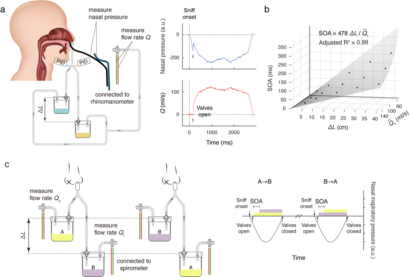 图1. a. 吸气同步嗅觉仪示意图。b. SOA与管长差和吸气流速关系模型。c. 气味序列分辨流程。