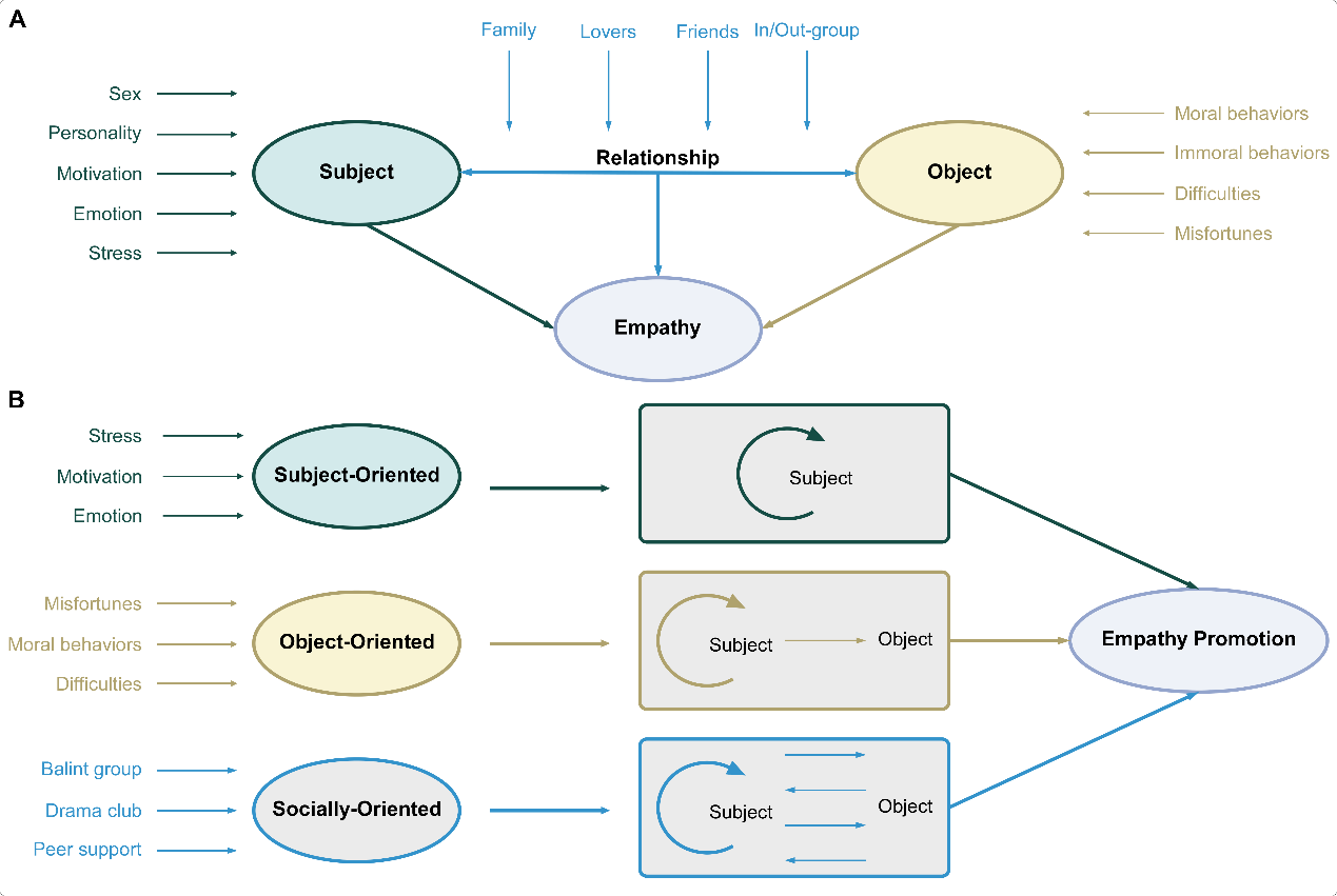 图1. 共情影响因素框架(A)和提升共情的训练方式分类(B)