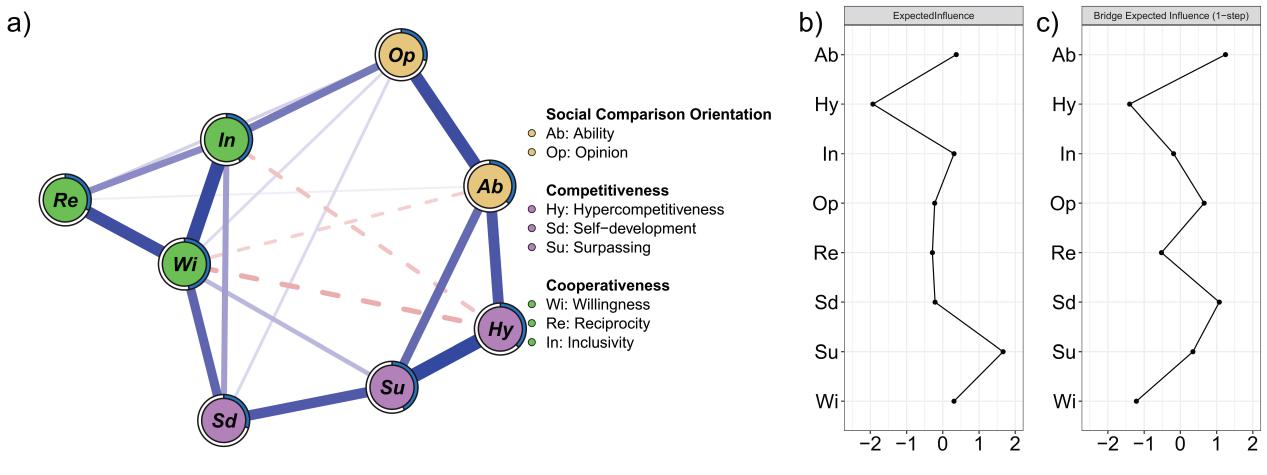 图1. a) 原始样本的竞争、合作和社会比较倾向的图形高斯模型;b) 标准化的EI中心性估计;c) 标准化的BEI中心性估计