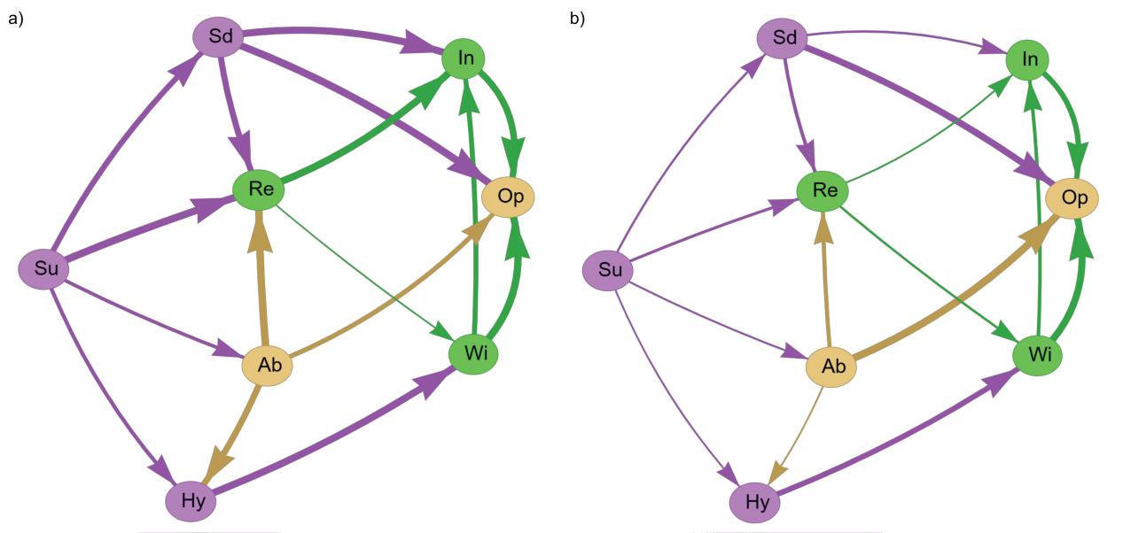 注:蓝色边缘表示正向关系,红色表示负向关系。边缘越粗代表关联性越强(最粗的边缘代表值为0.37)。Ab:SCO能力维度;Op:SCO观点维度;Hy:COM过度竞争;Sd:COM自我成长;Su:COM超越他人;Wi:COO合作意愿;Re:COO互惠性;In:COO包容性