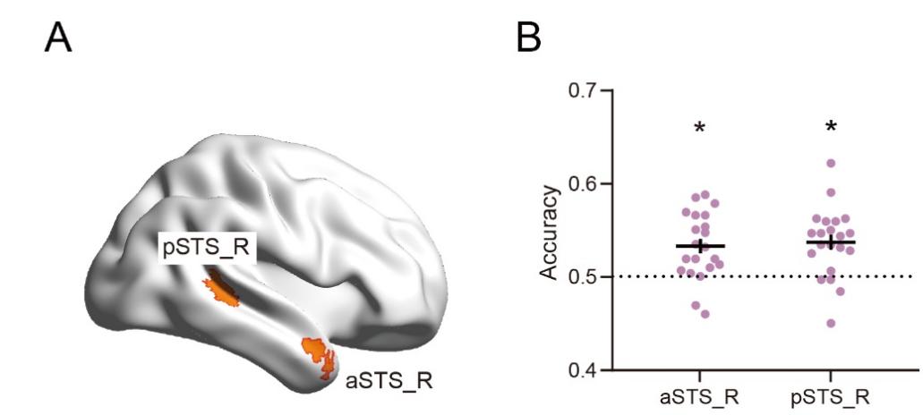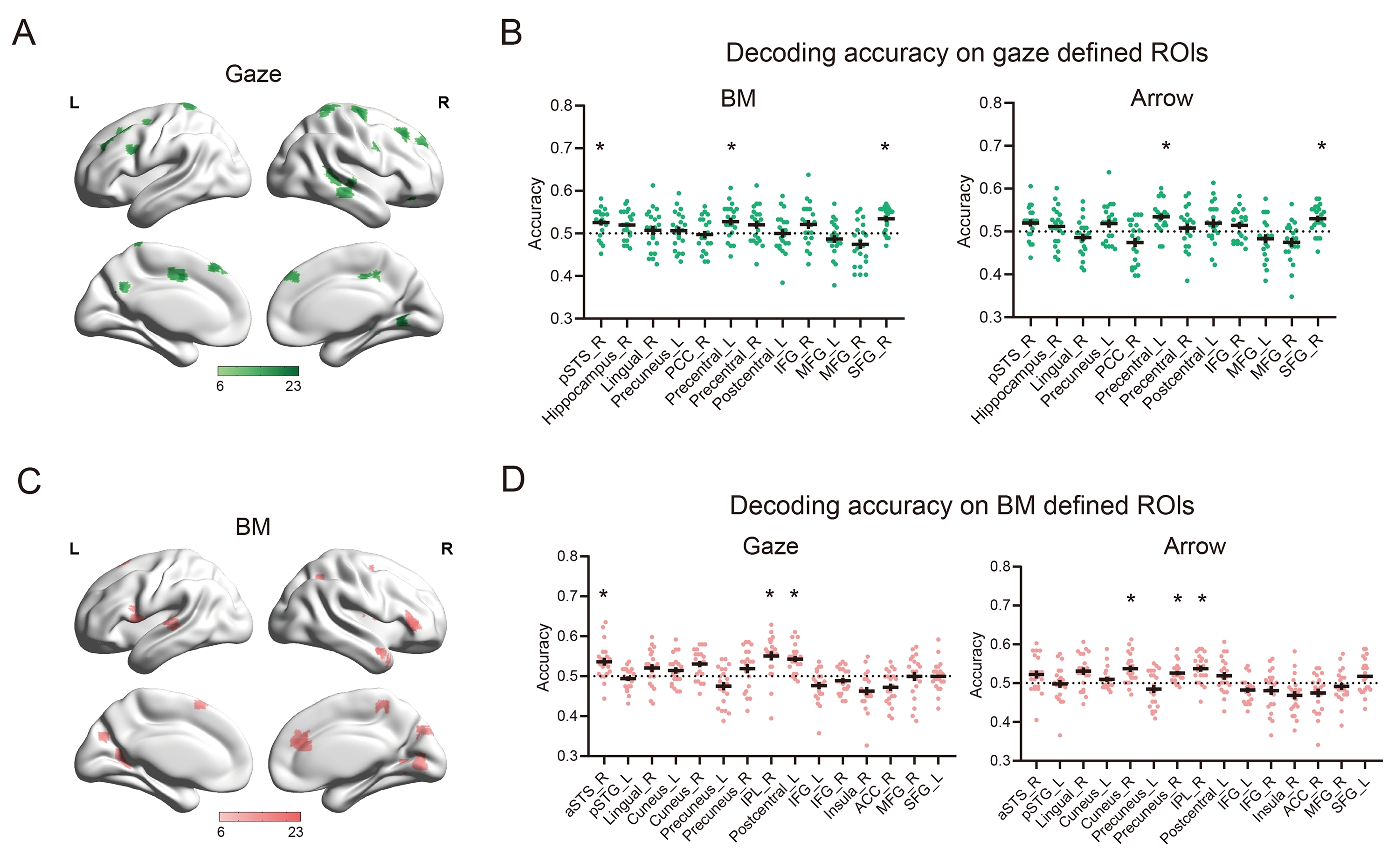 研究人员利用类别内多变量分析(MVPA)发现,眼睛注视线索诱发的注意效应在右侧后部颞上沟(pSTS)等区域的分类准确率显著高于随机水平;生物运动线索诱发的注意效应在右侧前颞上沟(aSTS)和左侧颞上回(pSTG)等区域的分类准确率显著高于随机水平(图2)。