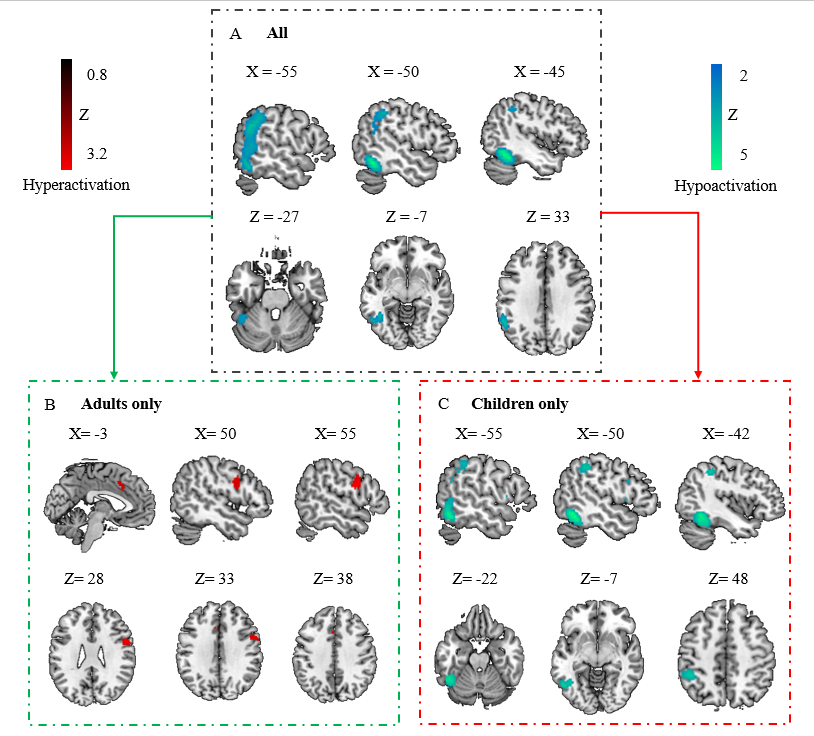 大脑功能方面的结果显示,存在这两种语言障碍之一的患者都在左侧颞下回、左侧颞中回、左侧顶下小叶等脑区表现出激活减弱。进一步区分儿童与成人发现,儿童在左侧颞下回、左侧顶下小叶、左侧中央前回、左侧颞中回及左侧额下回出现激活减弱,而成人在右侧中央前回、左侧扣带回出现过度激活(如图1)。这表明,左侧颞-顶区与额叶语言功能区激活不足可能是语言障碍共同缺陷机制,而右侧运动与执行控制区过度激活可能反映了语言障碍共同代偿机制。