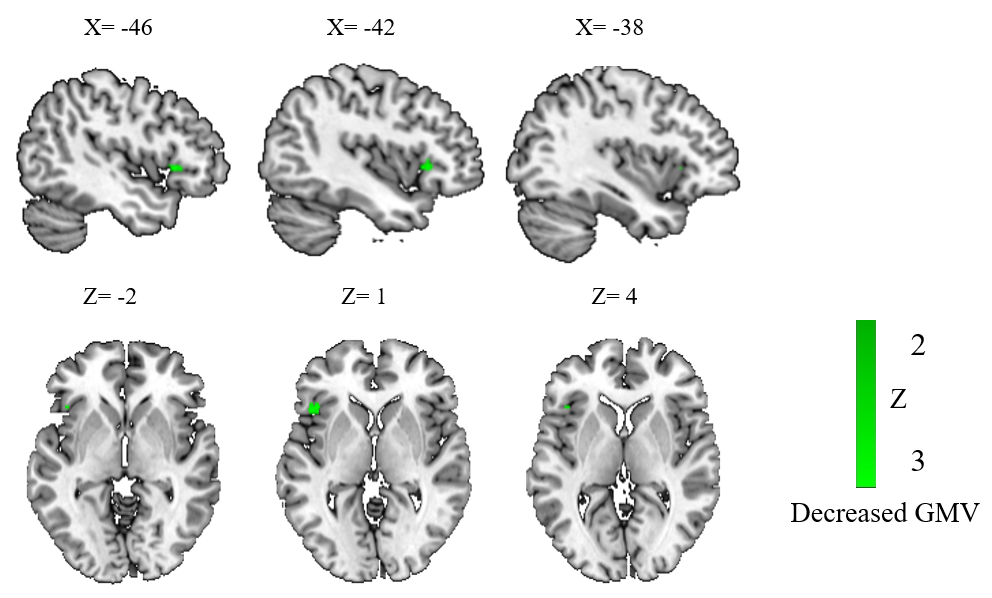 大脑结构方面的结果显示,仅儿童左侧额下回灰质体积减少(如图2)。这表明,左侧额下回结构异常可能是儿童语言障碍共同的结构基础。