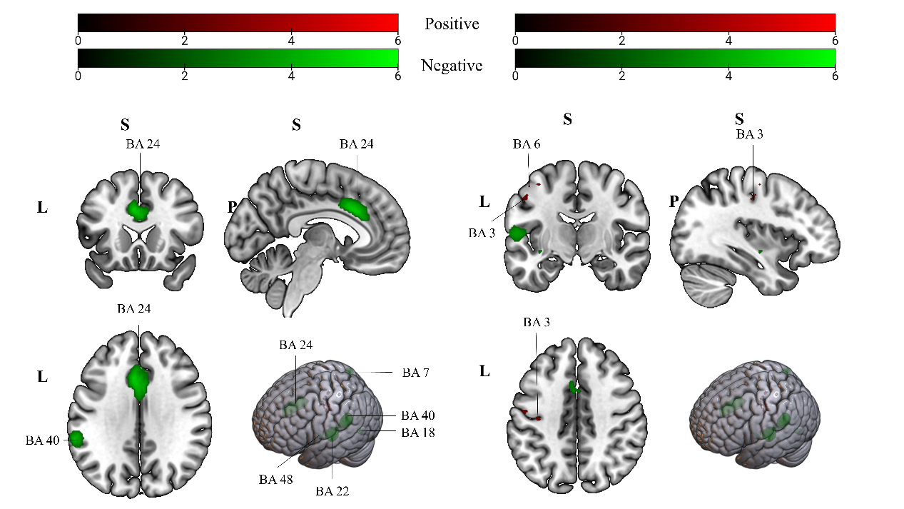 子研究2综合15项焦虑/抑郁障碍个体的fMRI研究,使用SDM-PSI进行基于坐标的脑影像元分析,发现焦虑和抑郁障碍个体在认知重评任务中均激活了认知控制区域,但存在差异:抑郁障碍个体抑制了情绪加工区域,而焦虑障碍个体未能有效抑制情绪加工区域(见图2)。