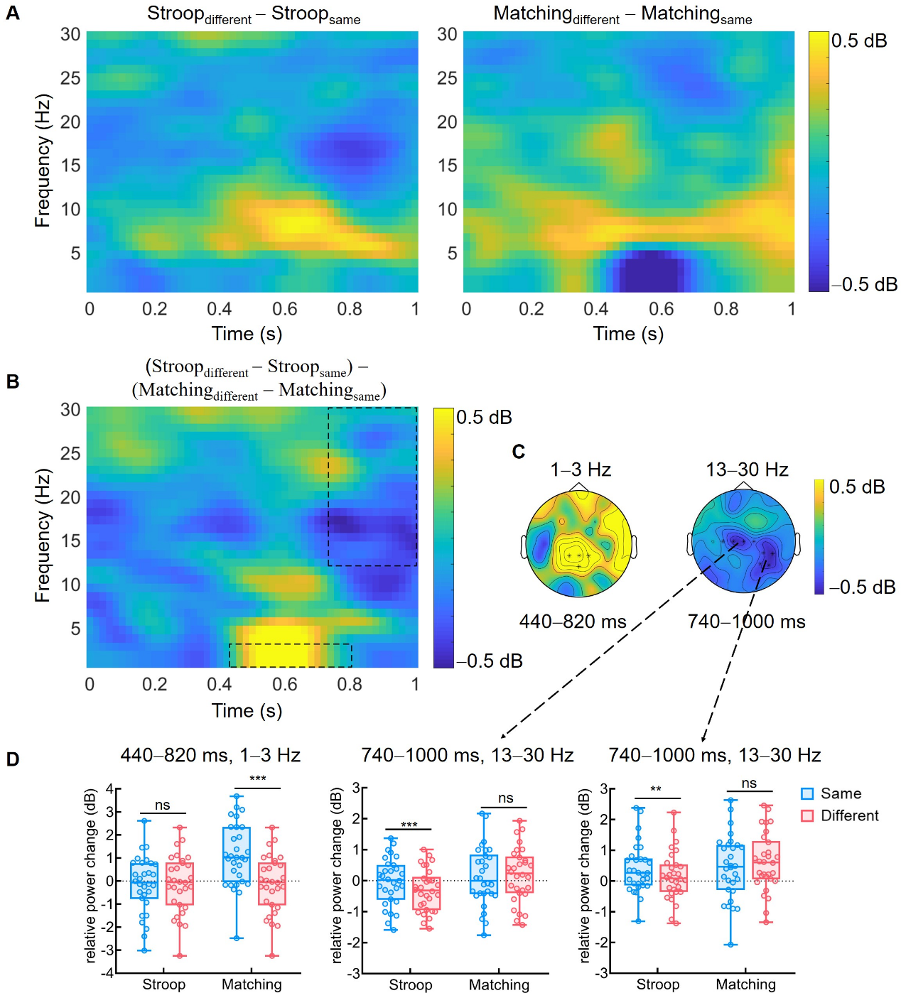 时频分析结果发现Stroop和Matching任务既有特异性也有相同的加工机制。特异性加工机制主要体现在中顶部delta频段和中部以及后顶部的beta频段,见图3。对于delta(1–3 Hz)频段,研究发现在Matching任务中,中顶部delta能量(440-820 ms)在一致条件下比不一致条件下高,而在Stroop任务中没有显著差异。这一结果说明选择性注意与分配性注意对跨通道的一致性的调制在刺激评估和决策过程中存在特异性。对于beta(13–30 Hz)频段,研究发现在Stroop任务中,大脑中部的beta能量(740-1000 ms)在不一致条件下比一致条件下降低的更多,反映了选择性注意对任务无关反应的抑制;此外,研究还发现后顶部的beta能量(740-1000 ms)在不一致条件下比一致条件下增加的更少,说明不一致条件下选择性注意抑制了视觉刺激(任务无关刺激)的加工。而Matching任务这两个脑区没有显著的beta能量变化。