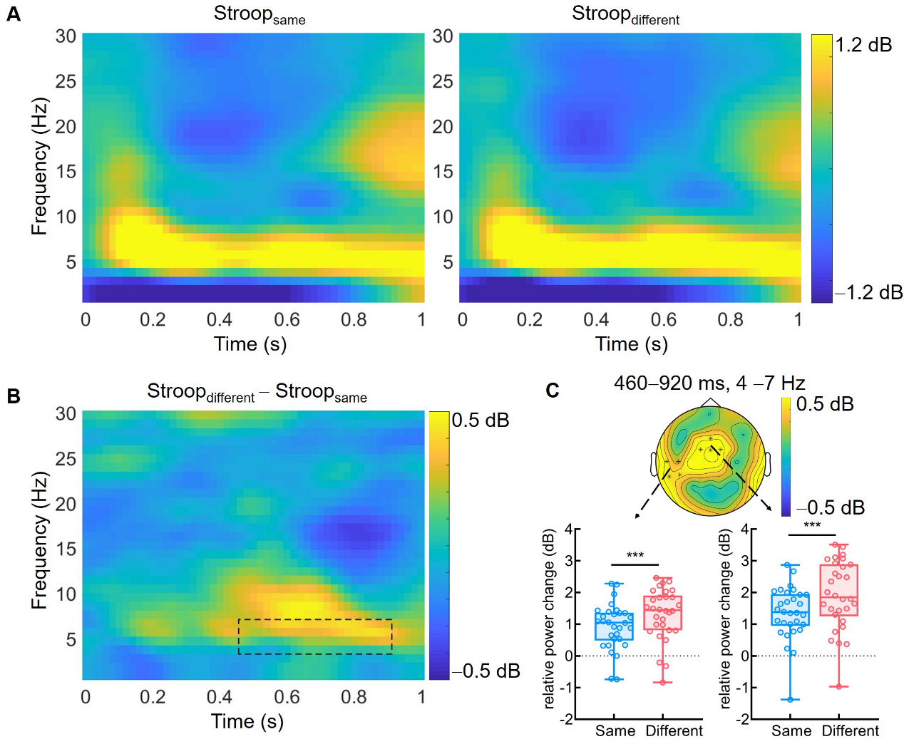 图4. 时频分析结果:Stroop任务在theta频段上的主效应