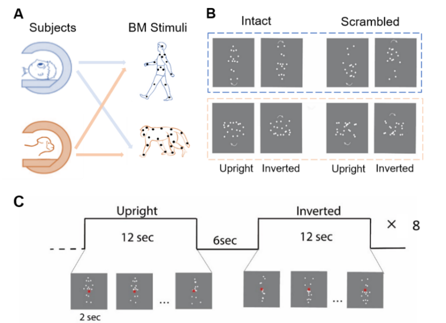 永乐汇蒋毅研究组和中国科学院生物物理研究所刘宁研究组开展了一项创新性的跨物种研究,利用核磁共振技术记录人类被试和猕猴被试分别观看正立和倒置的同物种和跨物种生物运动的大脑反应(图1)。