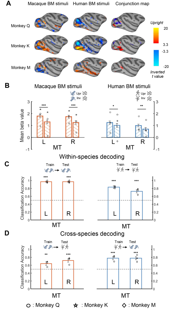 图2. 人类MT和pSTS对同物种和跨物种生物运动的反应