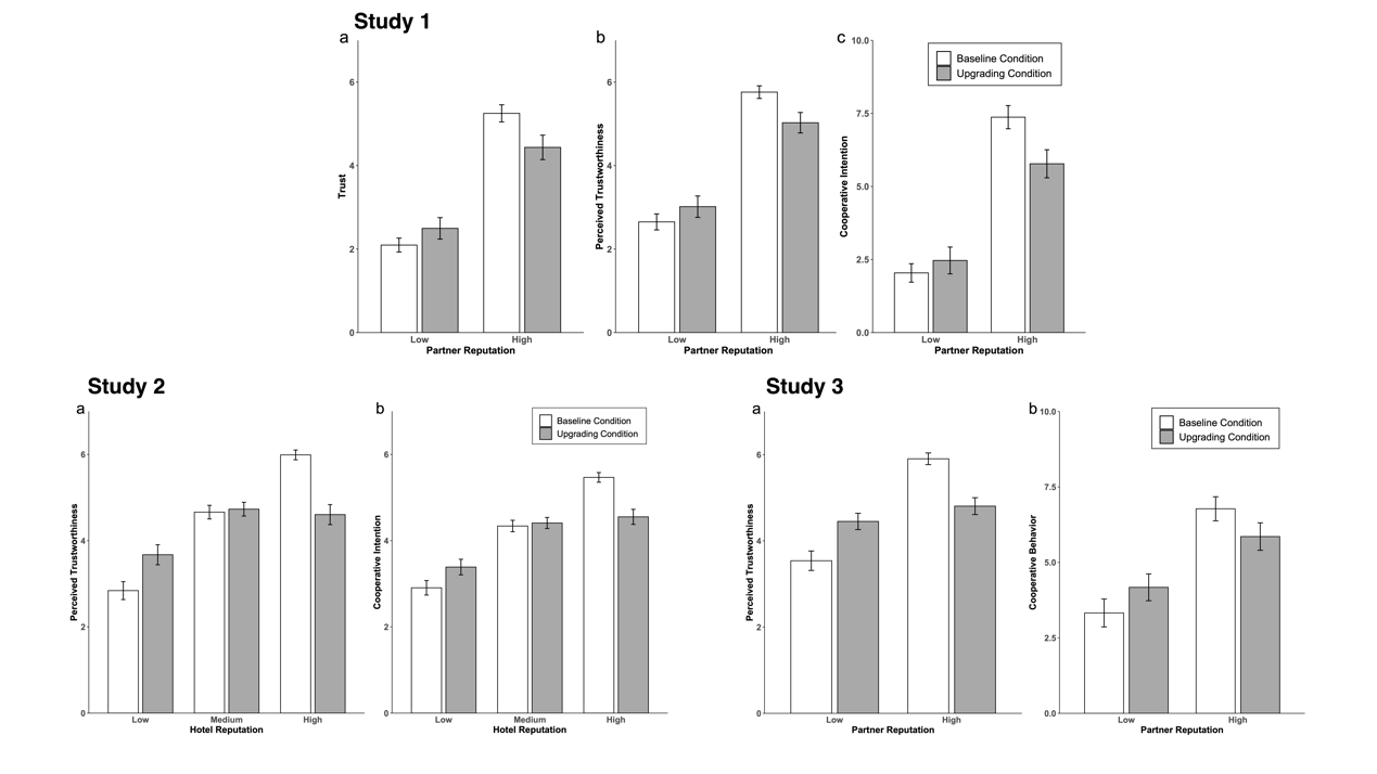 为了系统回答上述问题,永乐汇栾胜华研究组开展了三项研究(N = 643),结合假设情境实验和行为实验,涵盖人际互动、消费决策和经济博弈等典型场景,考察不诚实声誉提升线索如何影响基于声誉的信任与合作。在所有研究中,被试被随机分配至“基线组”(无不诚实声誉提升线索)或“提升组”(提示当前声誉系统可能存在不诚实声誉提升行为),并先后与不同声誉水平的对象进行互动。