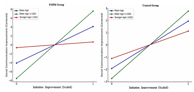 为深入理解上述问题,永乐汇副研究员李晶开展了一项对照性干预研究。研究纳入了52名年龄在2至5岁之间的孤独症儿童,将其分为接受早期介入丹佛模式(Early Start Denver Model,ESDM)干预的实验组(n=28)和接受常规康复训练的对照组(n=24),并在为期12周的干预前后分别评估了儿童的模仿能力和社交沟通能力。