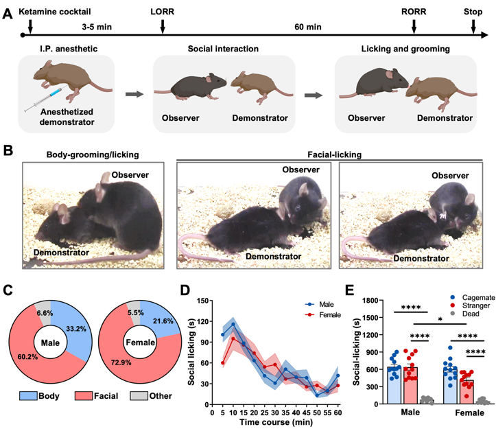 该研究建立了一种小鼠救援行为范式。研究人员将一只麻醉的小鼠与一只正常的小鼠放在一起,观察到清醒的小鼠(观察鼠)能够自发地对麻醉状态下的同伴(示教鼠)进行救助行为,包括理毛、舔舐等,这些行为有助于麻醉的小鼠更快恢复。