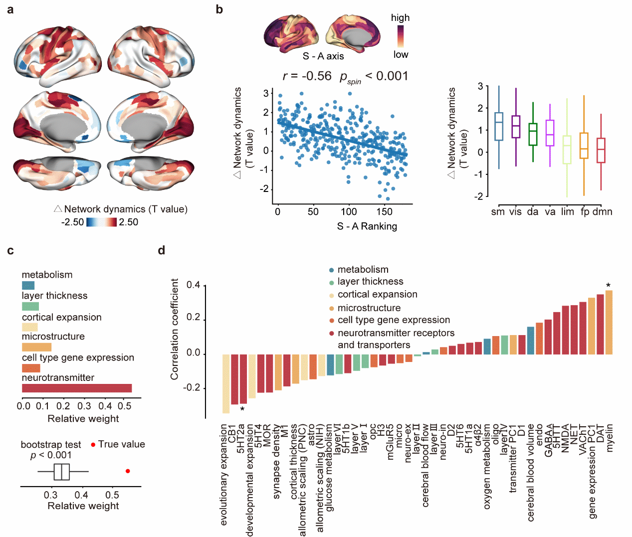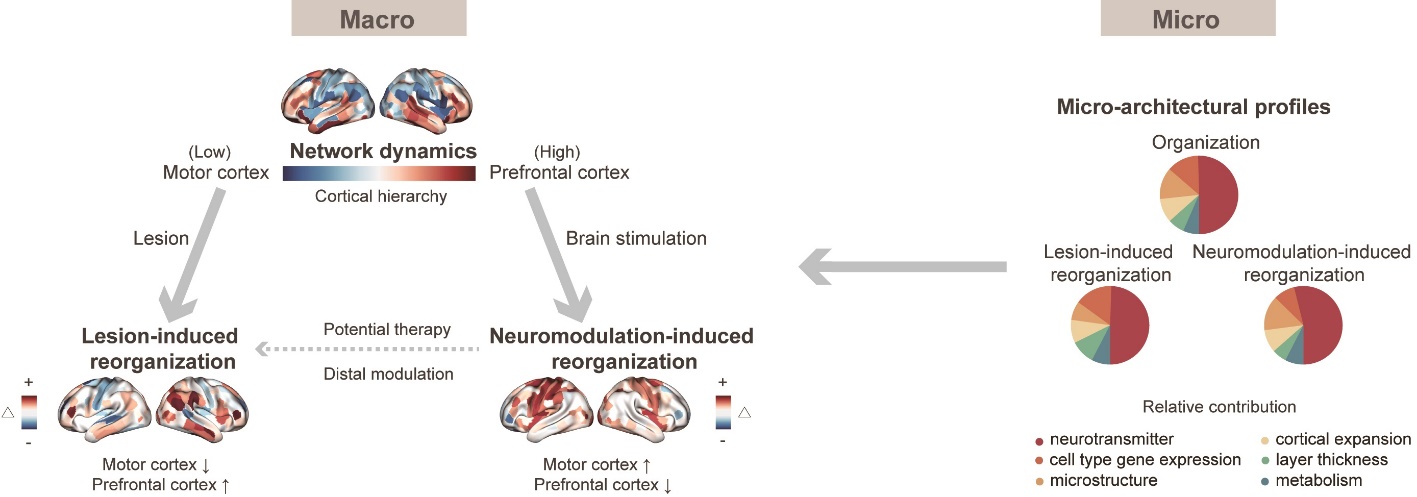 研究发现通过神经调控和脑损伤分别扰动感觉运动-联合轴的两端,即前额叶和运动区,能够沿该轴引发相反的网络重组模式。这种重组模式与大脑的微观属性,尤其是神经递质受体与转运体的分布,存在密切关联。研究阐明了大脑网络动态性的重组规律,为开发针对脑部疾病的治疗方案提供了理论依据。