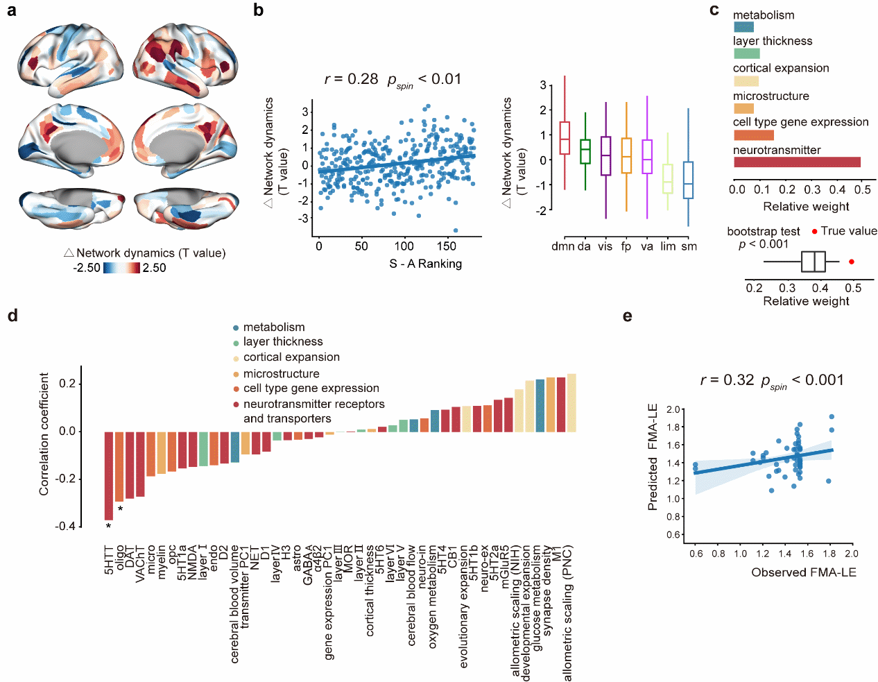 基底神经节局部病灶性脑损伤通过影响基底神经节-丘脑-皮质回路,进一步影响运动皮层功能。运动皮层位于感觉运动-联合轴的初级区域,在研究一中表现出较低的网络动态性。为探究运动通路受损对网络动态性的影响,研究三分析了脑损伤患者的网络动态性变化。研究结果表明,脑损伤患者的感觉运动皮层、内侧颞叶和枕叶的网络动态性减弱,后扣带皮层、外侧颞叶和内侧前额叶的网络动态性增强(图4a)。这种变化与感觉运动-联合轴呈显著正相关(图4b),与神经递质受体和转运体的空间分布密切相关(图4c)。此外,双侧运动区的网络动态性能够显著预测脑损伤患者的下肢运动功能(图4e)。