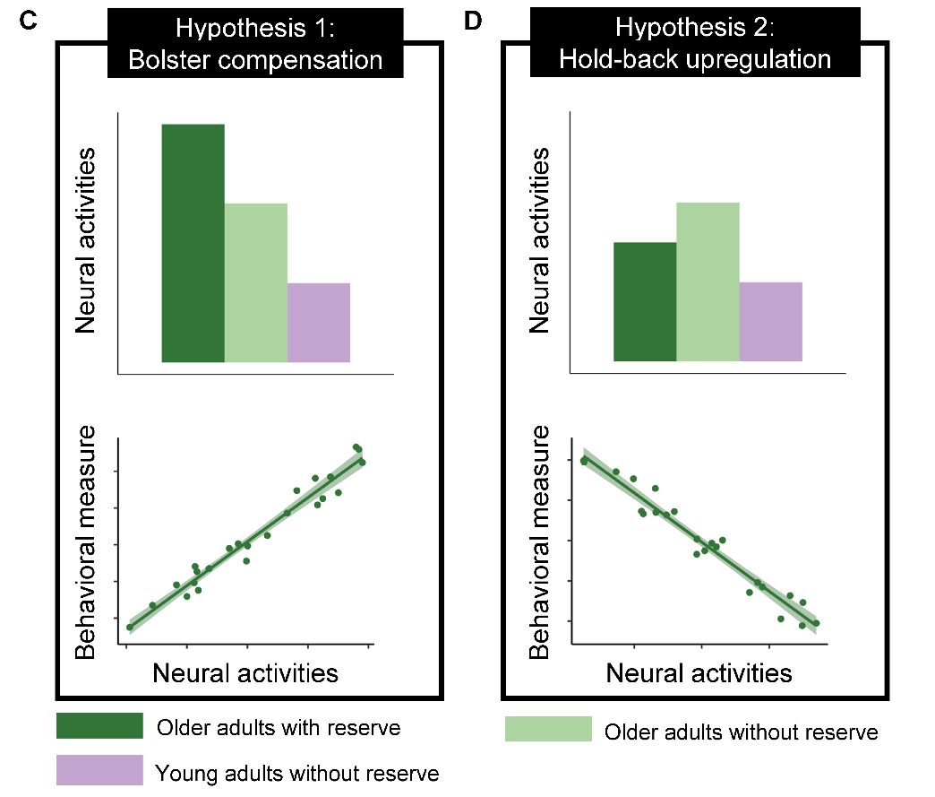 图1. “促进代偿”假设与“延缓上调”假设图示。符合两种假设的神经活动强度与脑-行为相关模式。