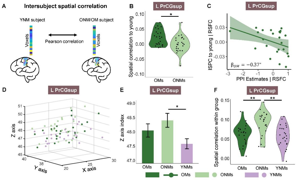 在进一步的跨被试空间相关分析中,研究者将老年参与者在任务中的多体素功能连接模式与年轻组进行比对(图3A)。结果发现,老年音乐家在左侧前中央回上部的脑活动模式与年轻人更为相似(图3B),且这种相似性与连接的年轻化程度显著相关(图3C)。组内分析还显示,老年非音乐家之间的脑活动模式更为一致(图3F),提示其老化过程更加统一。而老年非音乐家的功能连接峰值更偏向顶叶方向(Z轴坐标上移,图3D、E),进一步印证了其代偿性上调的特征。