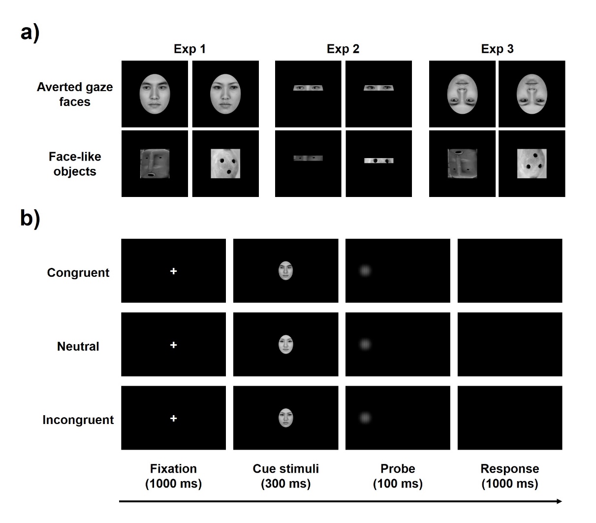 图1. 采集了目光转移面孔(a)和类面孔物体(b)视觉感知方向的距离,以作为后续实验的线索刺激