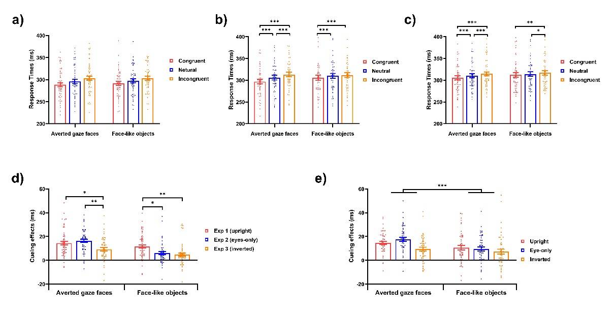 在实验过程中,参与者先观看这些刺激图片,随后图片消失,并在屏幕两侧的一侧迅速出现一个光栅作为目标物(图2)。通过测量参与者判断目标位置的反应时,来评估不同刺激对注意力的引导强度。反应越快,说明引导效果越强。除了实验1,研究团队还设计了其他多组对照实验:实验2仅呈现刺激的“眼睛”部分;实验3则是将刺激图片进行倒置呈现;实验4则结合上述三种呈现方式,综合比较在不同条件下,类面孔物体和目光转移面孔在引导注意力上的各自贡献。通过四个实验,研究团队得以解析“类似眼睛”这一局部特征和“类面孔”这一整体构型在引导注意力中的不同角色。
