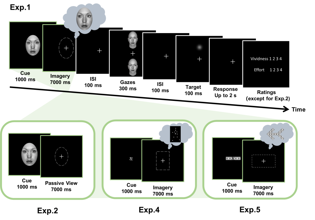 既然想象能有效地引导人们对颜色、一般物体等普通信息的注意,那么一个有趣的问题便浮出水面:这种效应能否作用于更高级的社会性信息呢?人类是社会动物,他人的目光注视以及肢体动作都是至关重要的社会线索。这些线索具有方向性,能提示他人所关注的位置并传递他人意图。如果在脑海中预先想象一个社会线索(例如眼睛的注视方向),人们是否会因此对现实中出现的同方向社会线索更加敏感呢?