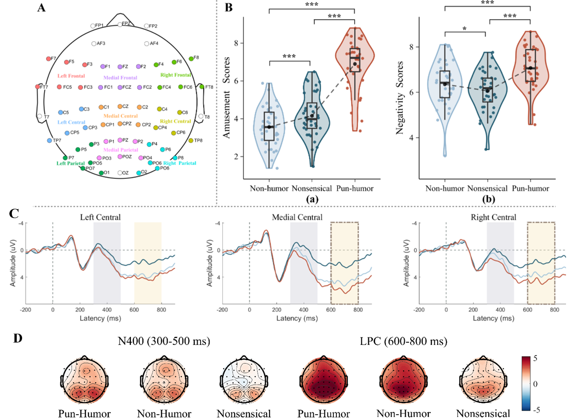研究团队设计了三类包含相同负面关键词的中文句子:双关幽默句(Pun-humor, 如“小明可能非常喜欢吃鱼,因为他是个爱挑刺的人”)、非幽默句(Non-humor)和语义无关句(Nonsensical)(见表1)。通过行为评分与脑电记录,系统考察被试在实时理解语言时的情绪体验。