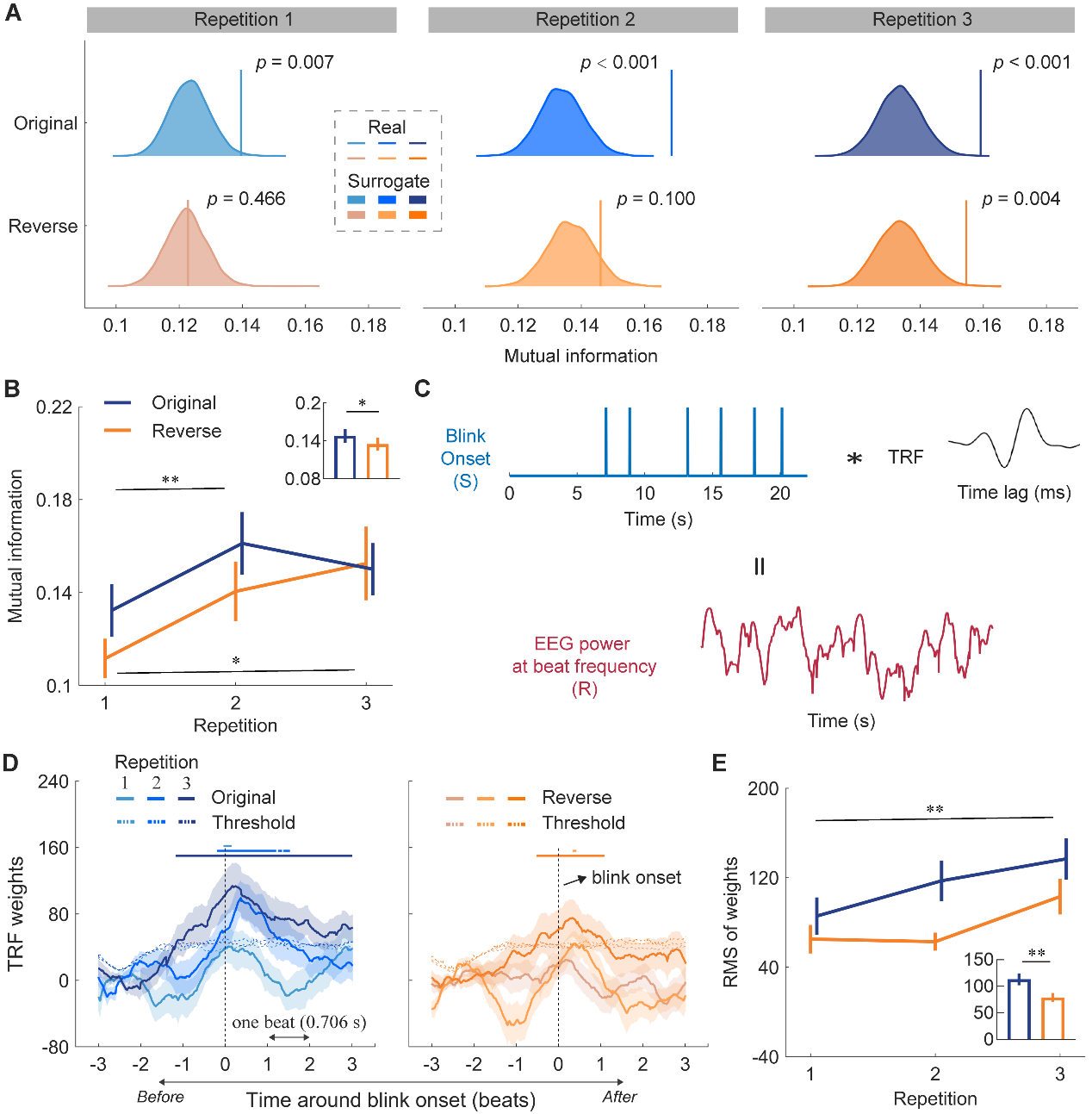 研究团队提出,这种眨眼同步行为可能源于听觉-运动系统的跨模态互动。为进一步探索机制,研究者分析了眨眼与脑电信号之间的“对话”。结果发现,两者之间存在显著的互信息关联(图3B),且时间响应函数分析发现,神经活动在眨眼发生前就已增强,表明大脑能“预测”眨眼时机(图3D)。