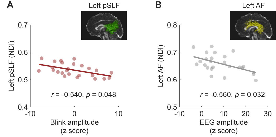 通过脑白质成像,研究还找到了这一行为的“脑结构基础”:眨眼同步能力更强的人,其连接听觉与运动脑区的神经纤维(左后侧上纵束pSLF)的神经突密度指数(NDI)更低;而神经同步能力更强的人,其左侧弓状束(AF)的神经突密度指数更低(图4)。