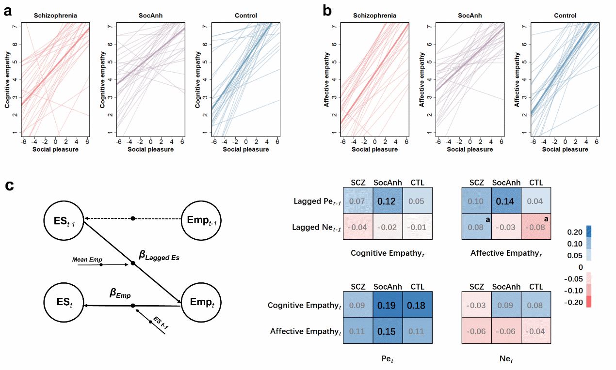 研究一纳入了46名高社会快感缺失个体与53名低社会快感缺失个体,每名被试连续7天、每天10次通过手机应用报告积极和消极情绪状态、社交体验以及认知和情感共情(平均完成率77.8%)。结果显示,相较于对照组,高社会快感缺失个体日常生活中的认知和情感共情水平降低,并且共情水平的降低与其社交愉悦体验、积极情绪状态的降低有关。