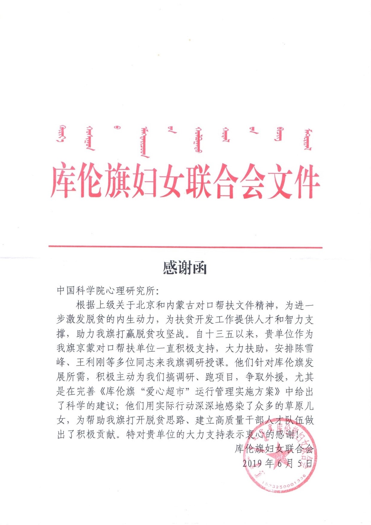 库伦旗妇联主席顾秀英向心理所送感谢信
