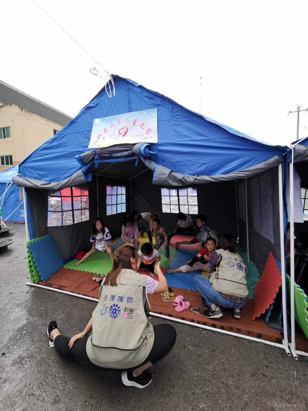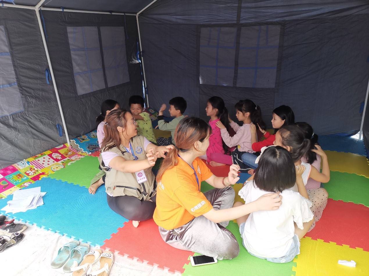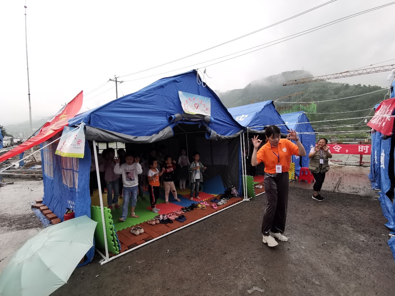 6月20日中午,联盟副秘书长王蔺率先到达长宁地震灾区开展心理援助需求调研和工作对接,了解到此次受灾的长宁县和珙县分别设立多个帐篷安置点,并且因为余震不断,大家都时刻保持高度警觉,成人也多表现出创伤后应激反应(如睡眠不好、经常感觉在晃、聊起地震情绪容易激动等),儿童则往往在白天表现得很兴奋、新奇,在晚上出现一些创伤反应和退行性行为(如不愿意或不敢独自睡觉、晚上惊醒、哭闹等)。通过长宁团县委和珙县妇联等的协调,分别在长宁县和珙县最大的安置点建立青青儿童乐园和儿童之家,通过儿童社区活动介入安置点的心理援助,并开展了安置点走访、心理科普资料发放等工作。