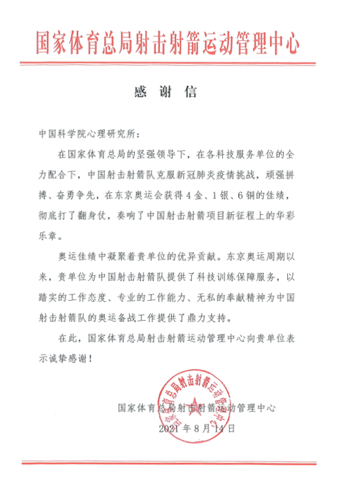 国家体育总局射击射箭运动管理中心致中科院心理所的感谢信