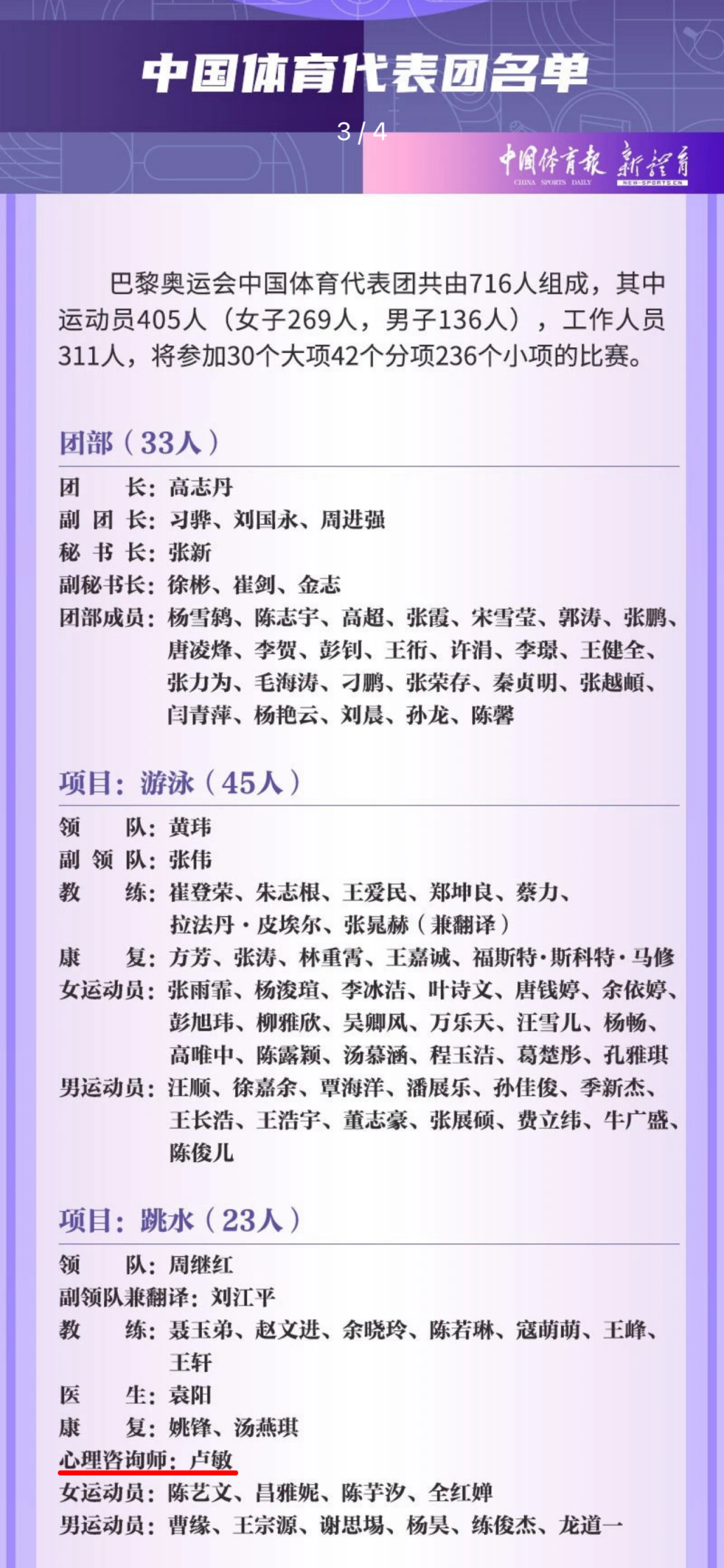 7月13日,第33届奥林匹克运动会中国体育代表团正式成立。中国科学院心理研究所国家公务员心理健康应用研究中心副主任卢敏博士以巴黎奥运会中国队现场心理保障组专家的身份位列其中,并与中国跳水队一起于7月21日出征巴黎。