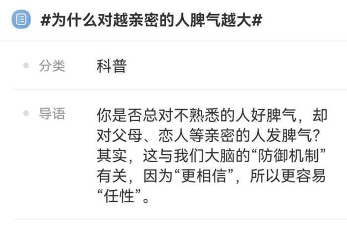 对陌生人和颜悦色,却容易对亲近的人心生不满;明明是关心,话说出口却成了指责……“为什么对越亲密的人脾气越大?”不久前,这个话题一度登上热搜,很多人感叹,自己也存在类似的问题。