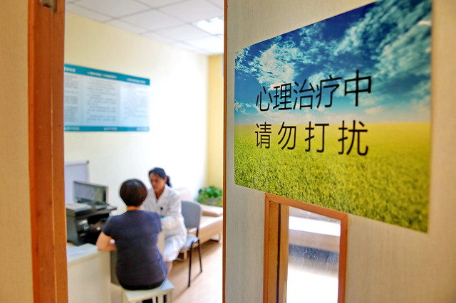 浙江嘉兴,武警浙江省总队医院心理咨询门诊内,心理专家正在接诊一名心理疾病患者