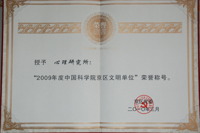 此次荣获2009年度中国科学院京区文明单位称号,既是对心理所前一阶段精神文明建设工作的充分肯定,更是对我们的巨大鼓舞。2010年,心理所人必将在所领导班子的带领下以更大的热情、更高的标准投入到精神文明建设中,使全所的精神文明建设更上一层楼,为推动“创新2020”顺利实施提供坚实的思想和组织保证。