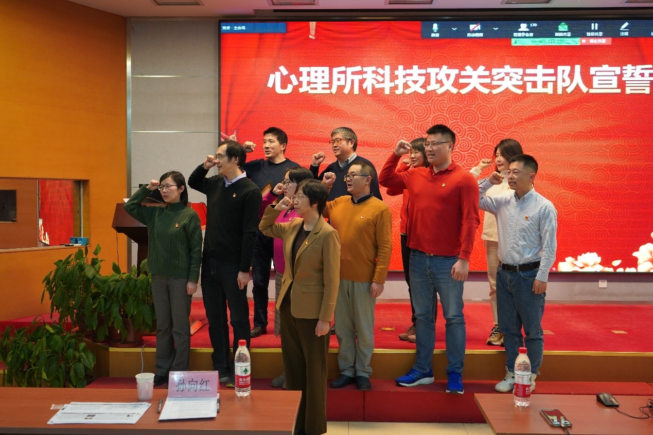 会议还举办了以老科学家命名的科技攻关突击队授旗仪式。孙向红、傅小兰、副所长陈雪峰分别为潘菽科技攻关突击队、荆其诚科技攻关突击队、徐联仓科技攻关突击队授旗,现场的突击队队员进行了庄严宣誓。突击队队员立志对标老科学家精神,始终以“健康中国”“平安中国”战略需求为己任,牢记心理学科技国家队的职责使命,聚焦心理学原创性科学研究和技术创新,紧紧围绕“四个率先”“两加快一努力”目标要求,发挥尖刀连和排头兵作用,为实现高水平科技自立自强贡献力量!