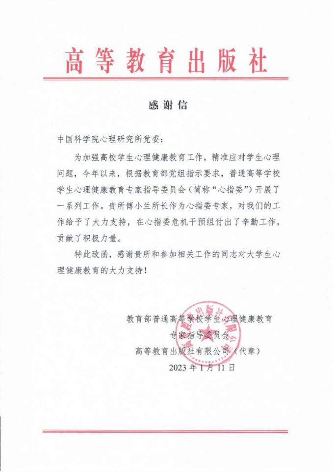 感谢信中称,心理所傅小兰所长作为心指委专家,对心指委的工作给予了大力支持,在心指委危机干预组付出了辛勤工作,贡献了积极力量,感谢心理所和参加相关工作的同志对大学生心理健康教育的大力支持。